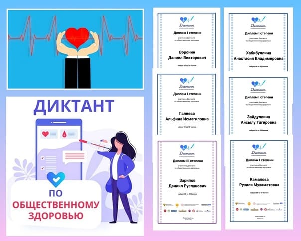 Школа принимает участие во Всероссийском диктанте по общественному здоровью. Участники диктанта имеют возможность получить представление об основах общественного и личного здоровья и проверить общий уровень знаний в этих областях. Задания диктанта в форме теста, состоящего из 50 вопросов, на каждый из которых есть только один правильный ответ. Лучшие участники награждаются дипломами. Приглашаем к участию школьников в возрасте 14 лет и старше, а также родителей. Пройти диктант можно на сайте publichealth.ru.