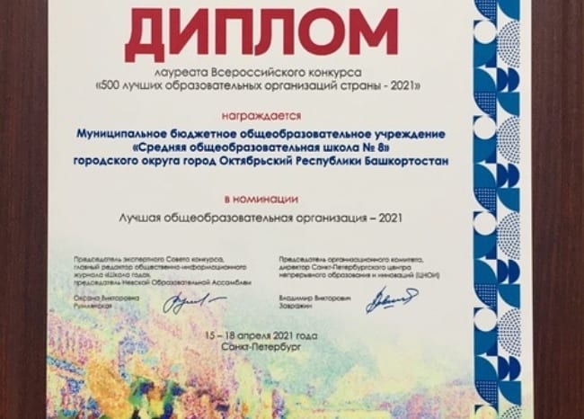 Завершился Всероссийский конкурс "500 лучших образовательных организаций страны - 2021". Основной целью конкурса являлось выявление и поддержка наиболее эффективных методик и технологий организации образовательного процесса с целью их трансляции и практического применения в образовательной среде. По итогам конкурса школа награждена дипломом лауреата в номинации "Лучшая общеобразовательная организация -2021"и медалью «500 лучших образовательных организаций страны – 2021».